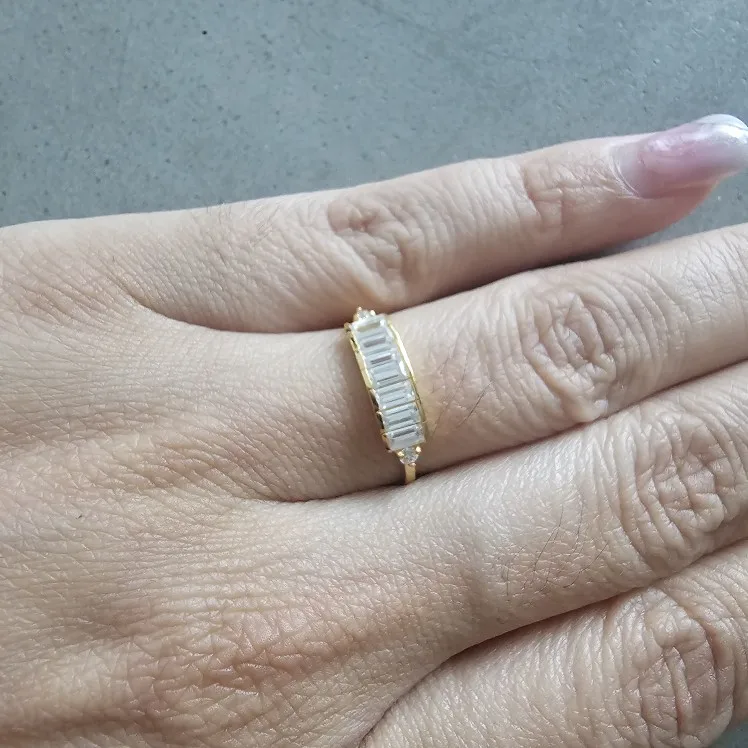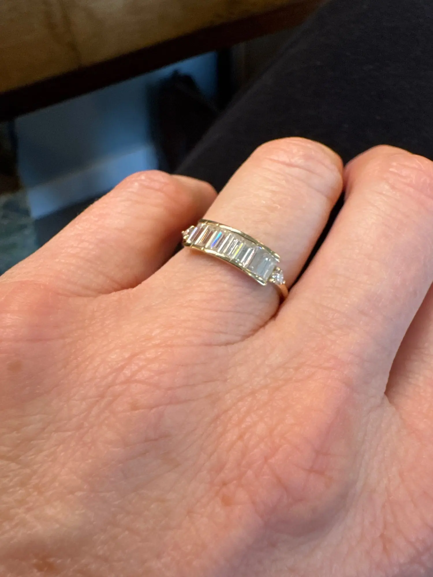 A lovely little ring that is well made. The moissanite has a real shine - not quite as glittery as other cuts (to be expected) but no less beautiful.