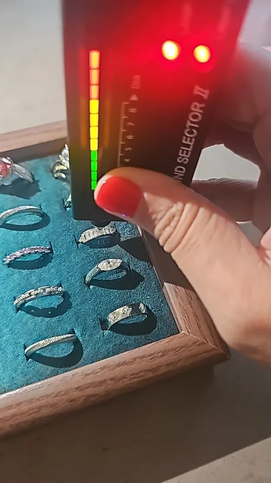 Diamond test: thermal tested and tests like a diamond (set for 24c air temp and stone < 0.5 ct). All stones are moissanite.